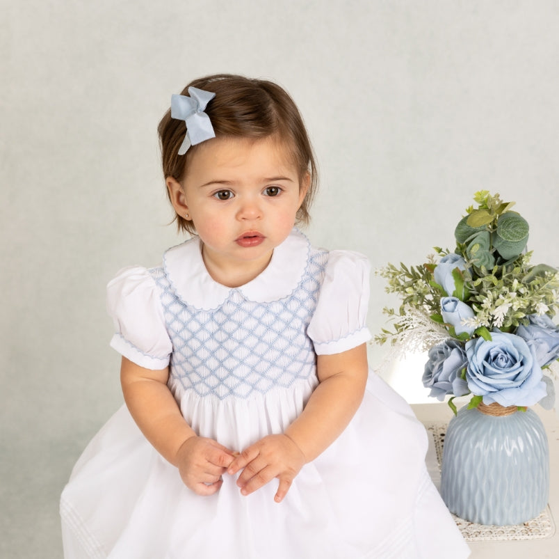 This refined pink knit gown showcases a graceful white ruffle collar embellished with delicate embroidered bows, creating an understated yet polished aesthetic. Crafted for newborns and infants, it captures timeless elegance through its soft, feminine silhouette and thoughtful details. Ideal for milestone celebrations and treasured photographs.