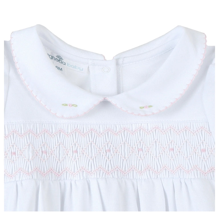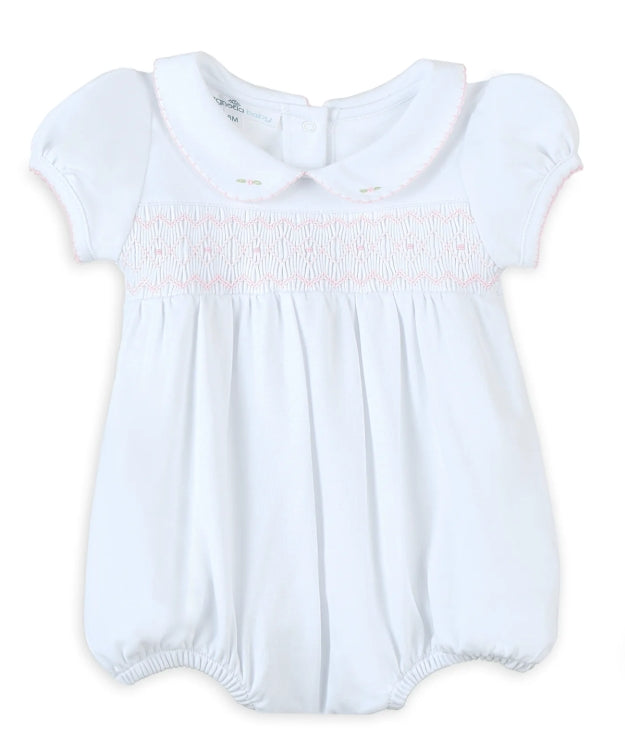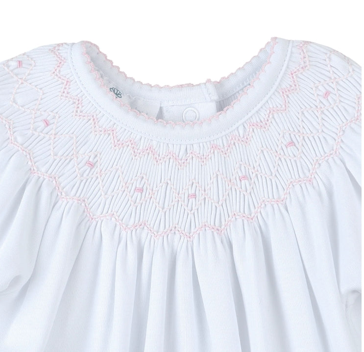 A smocked dress unlike any other! This beautiful little girls dress is a Feltman Brothers classic, with its smocked bodice, delicate hand embroidery, and dainty fagoting trim. Available in soft pink and blue colors, with a sweet peter pan collar and intricate hand made diamond embroidery on the smocking, as well as on the sleeves. Ties in the back with a big classy bow for an elegant finish. In this delightful little dress, your loved one is sure to steal the show every time. Feltman Brothers' Collared Smocked Dress - set to become a treasured family heirloom for generations!