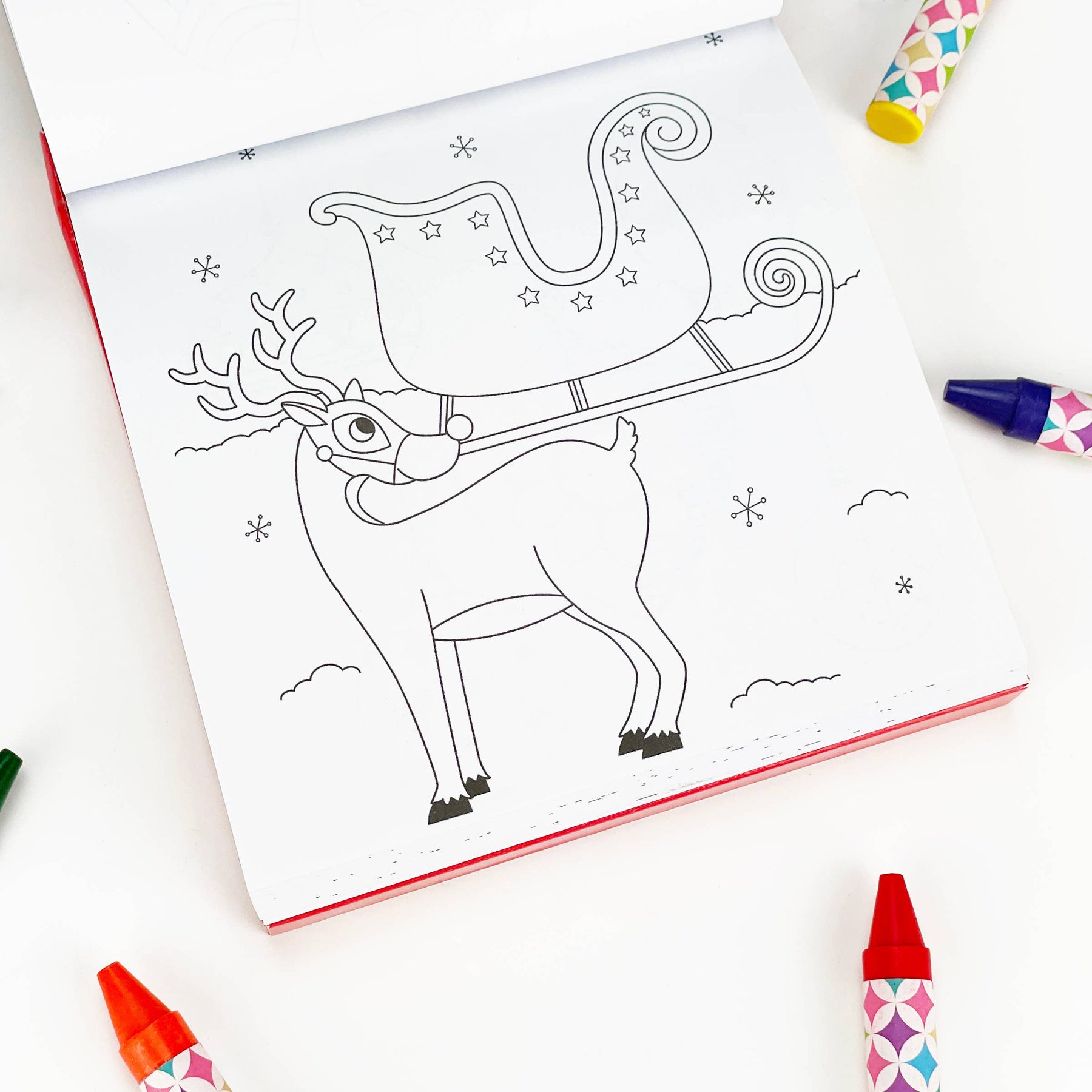 Pages in this coloring book for kids feature wintery and holiday scenes with reindeer, stockings, Christmas trees, and more.