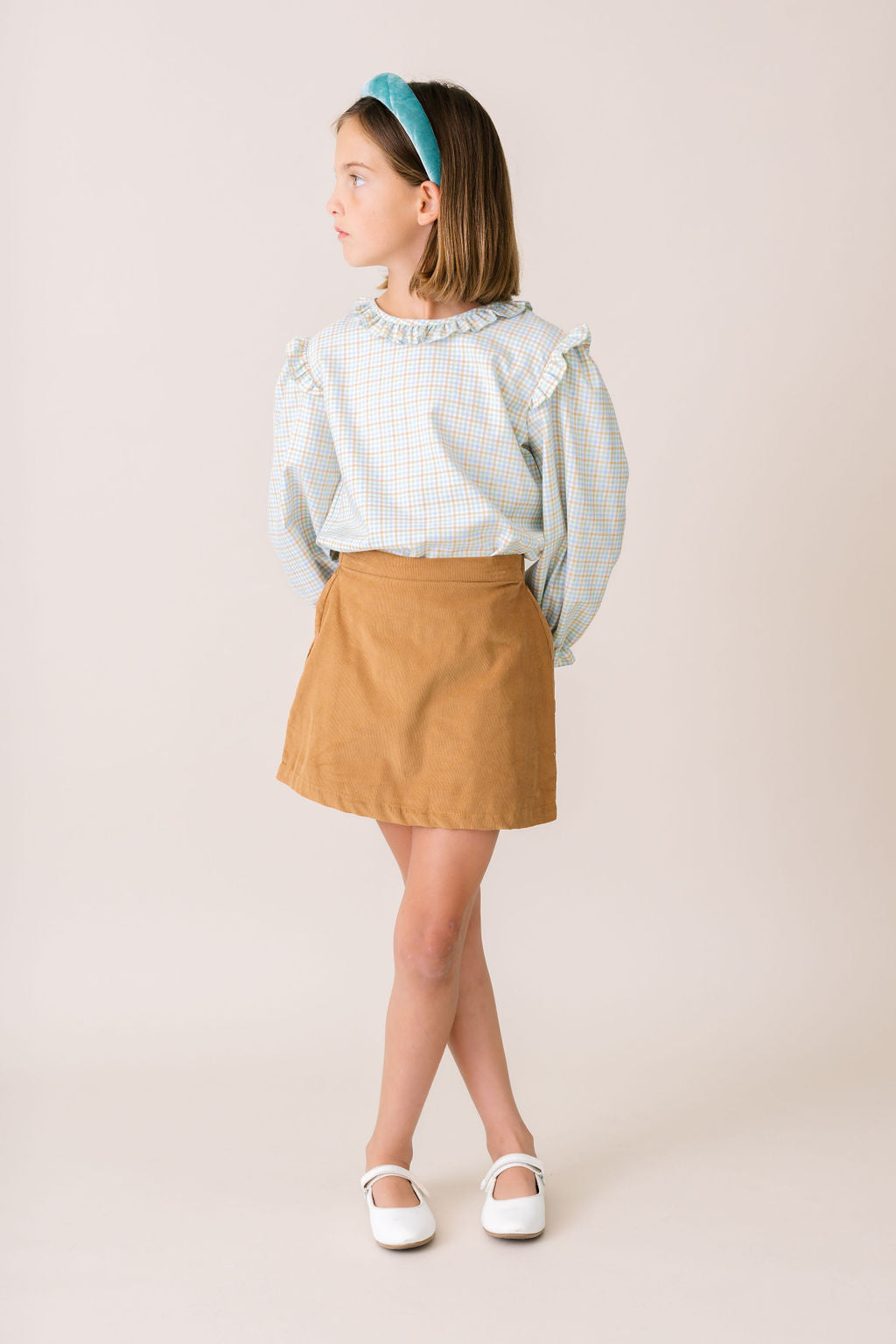 Classic meets contemporary with our Julia Skirt in Alexandria Khaki Corduroy, featuring a stylish side pleat and two-button detail. Crafted from soft, durable corduroy, this skirt adds a touch of sophistication to any outfit while maintaining everyday comfort. The side pleat offers a subtle flair, giving it a playful, modern silhouette. Perfect for pairing with sweaters, blouses, or tees, this versatile skirt is ideal for school or weekend outings. The neutral khaki shade makes it easy to mix and match, making it a must-have piece in your tween's wardrobe.