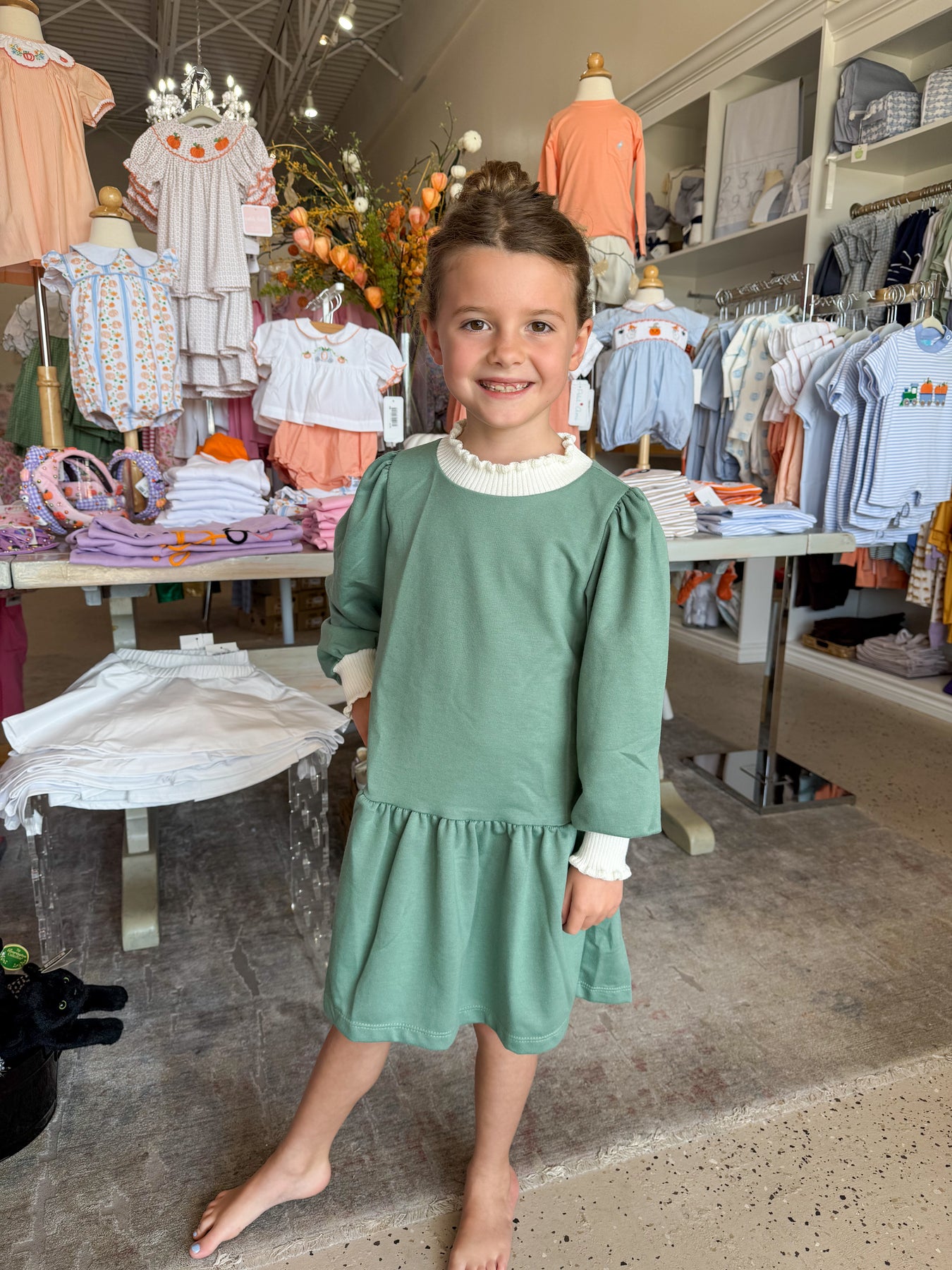 Casual yet classic, the Dorothy Dropwaist Dress is crafted from our soft Clover Green knit. Featuring crisp cream trim at the cuffs and neckline, this dress combines playful detail with a timeless silhouette. The gathered drop-waist skirt adds just the right amount of movement, making it perfect for everyday adventures, school, or casual outings.
