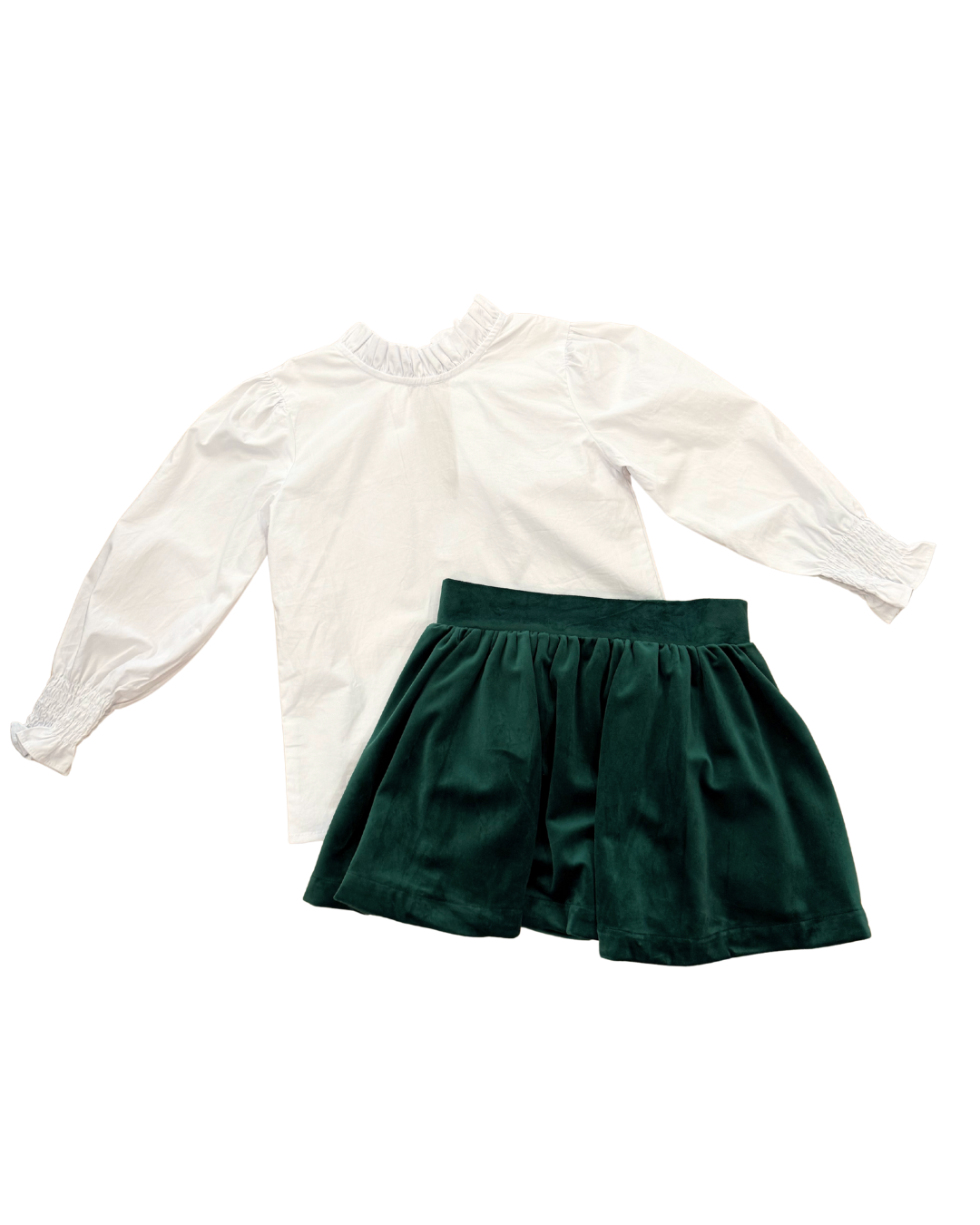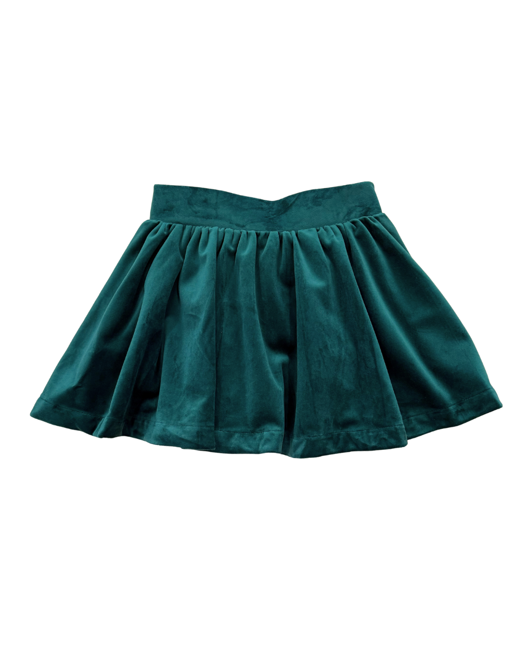 Green velvet skirt. Zipper back, and flares out at the waist. Top sold separately.