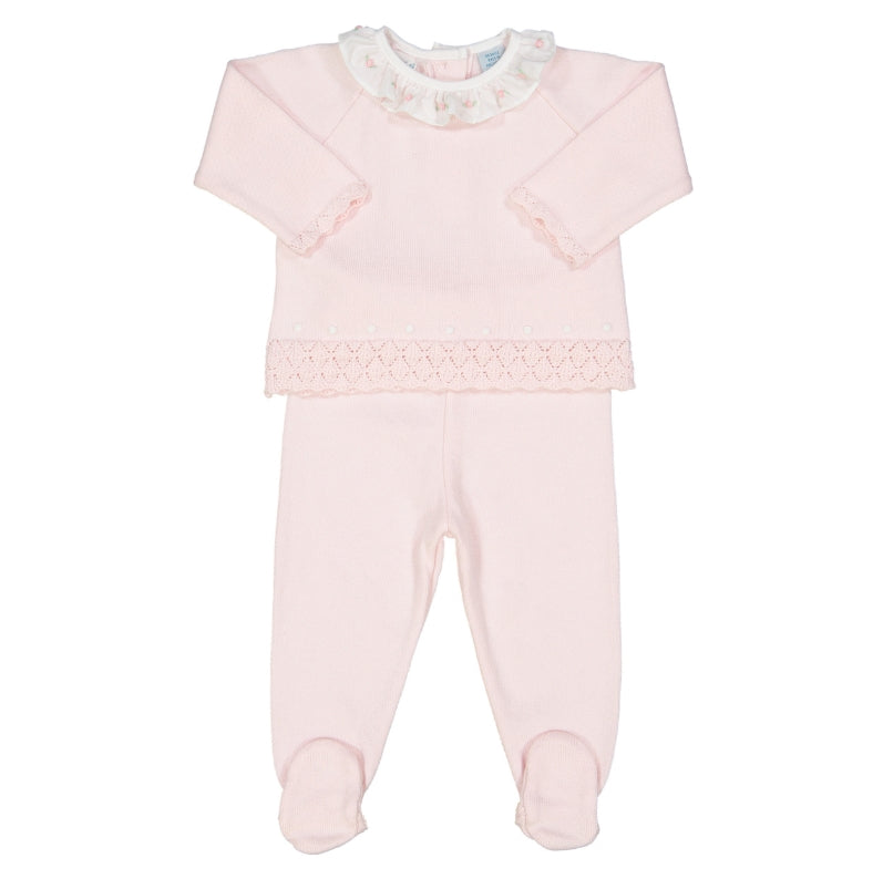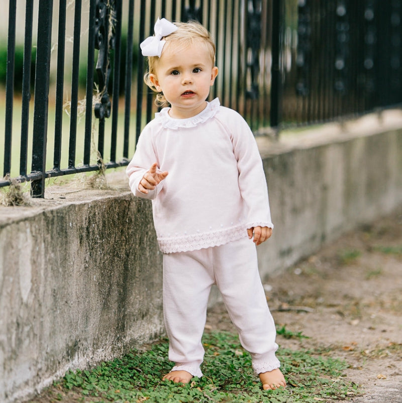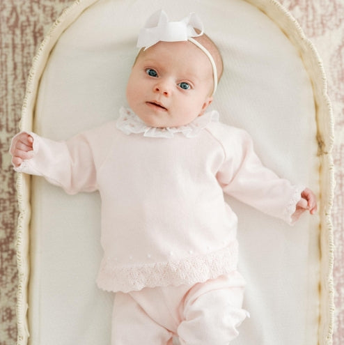 Want your baby girl to stay warm this winter while still looking cute-as-can-be? Check out this adorable knit set from Feltman Brothers! This classy and cozy 2-piece set features the most beautiful diamond pointelle at the edges, along with a sweet embroidered dot design. Plus, it's got a white ruffle collar with hand-embroidered rose bullions that will just melt your heart. (Closed feet in sizes Newborn - 9 months.)