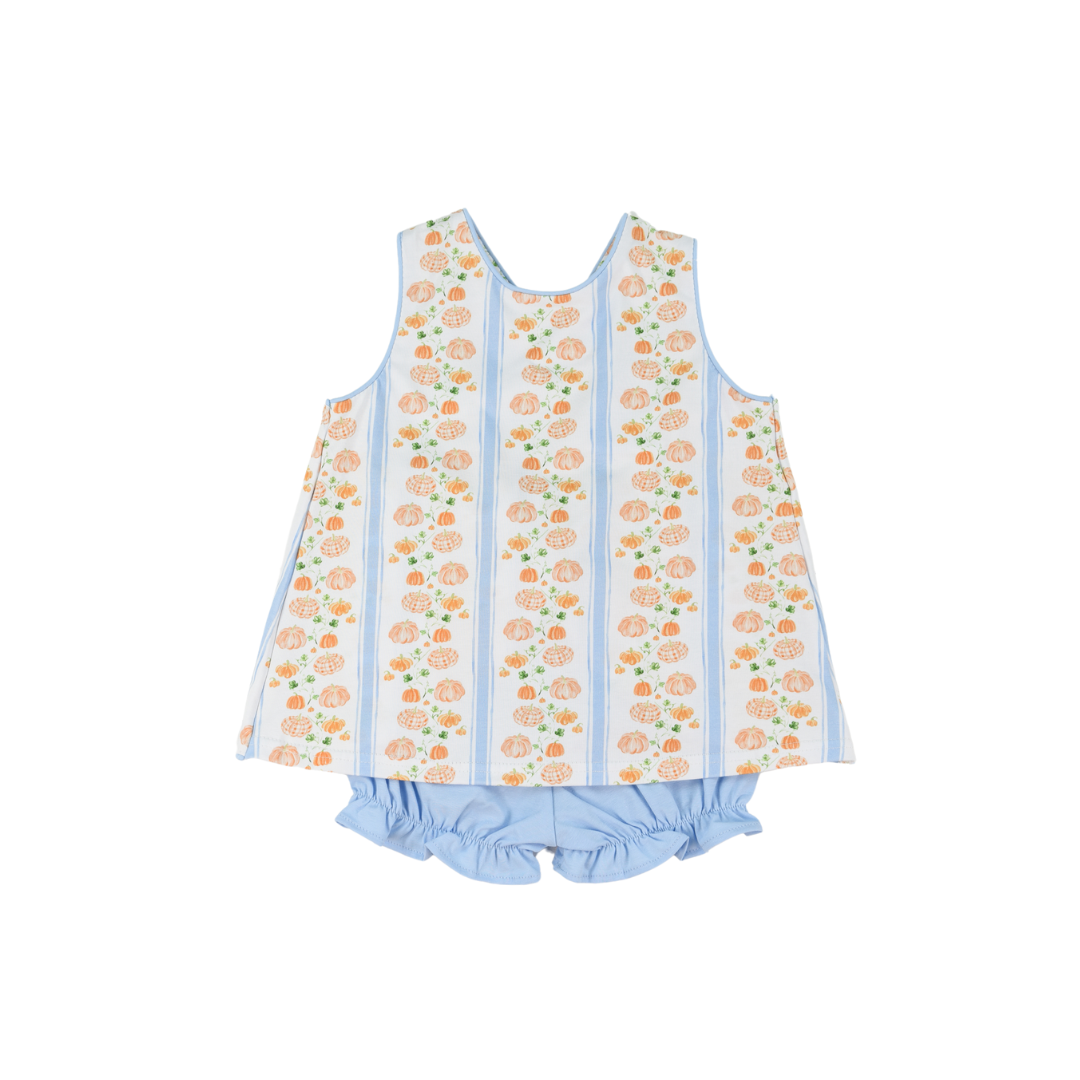Cotton knit pumpkin print bloomer set with crossover back straps.