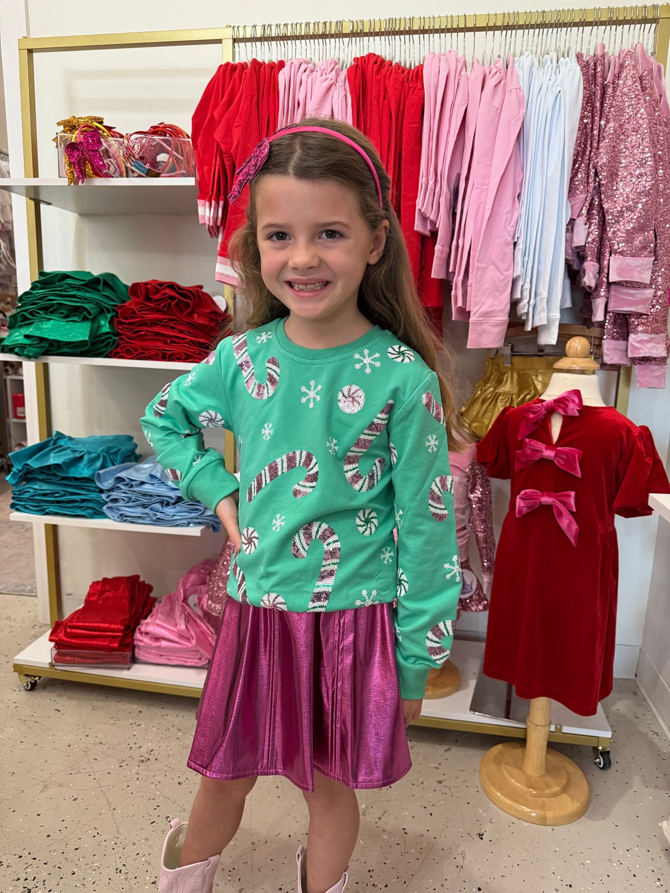 Teal sweatshirt with sequin candy cane and snowflake applique.