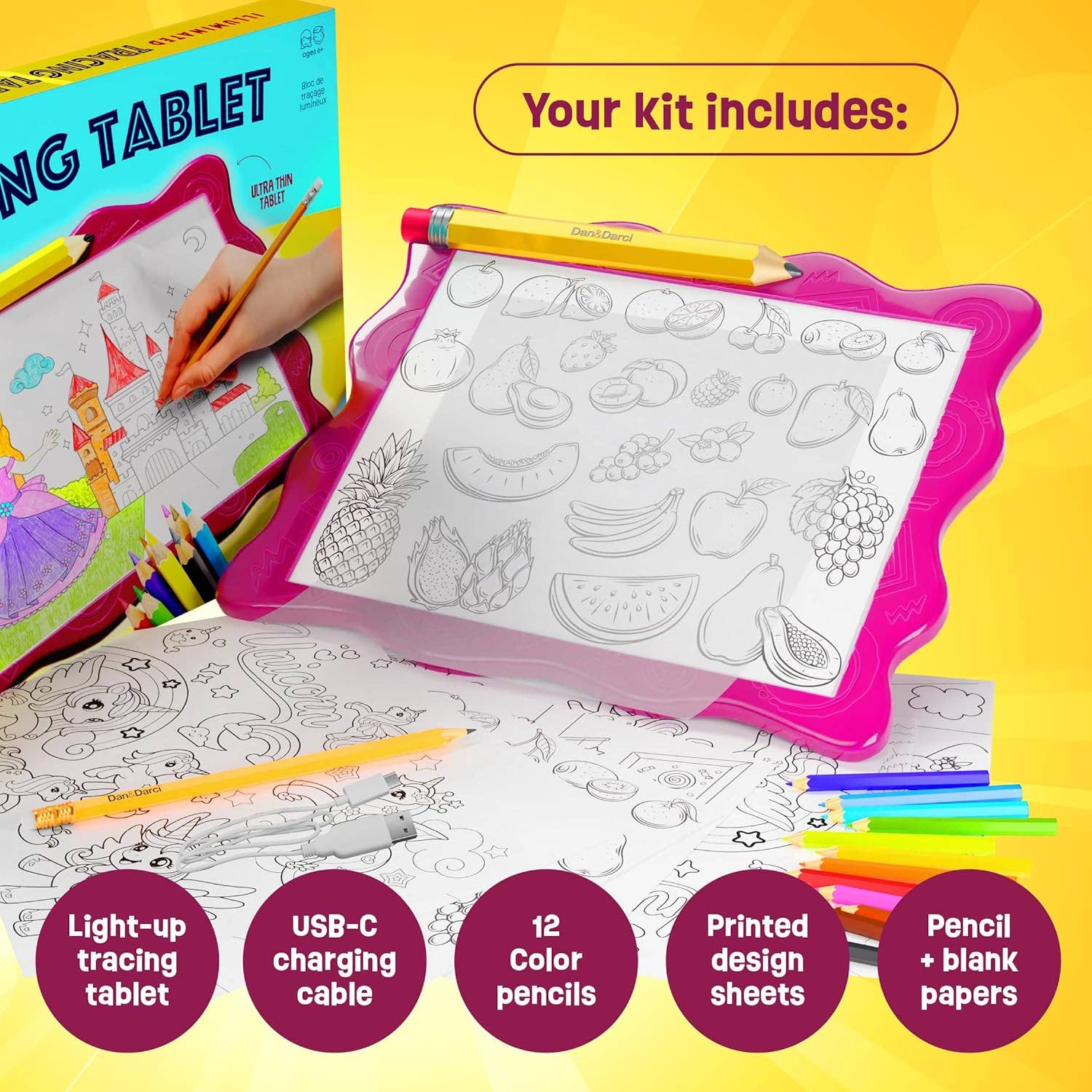 Complete Creative Set: Includes the Light-up Tracing Pad, 12 vibrant color pencils, a standard pencil, a USB charging cable, a variety of printed design sheets to kickstart their imagination, and plenty of blank sheets for limitless creations.